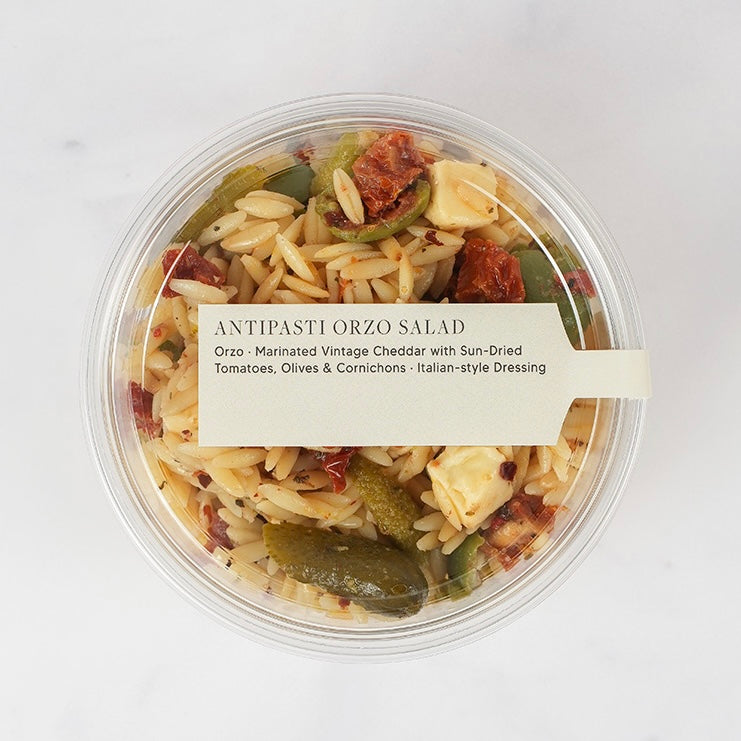Orzo with marinated vintage cheddar with sun-dried tomatoes, olives, cornichons & an Italian-style dressing.