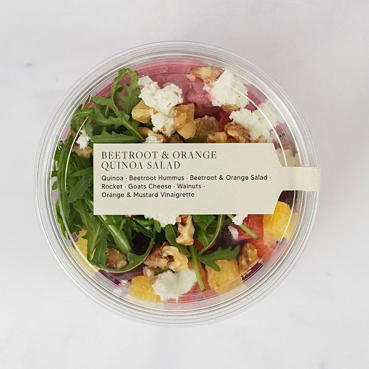 Beetroot & Orange Quinoa Salad Pots with Goats Cheese contains: MILK, MUSTARD, SESAME, TREENUTS (V, GF)