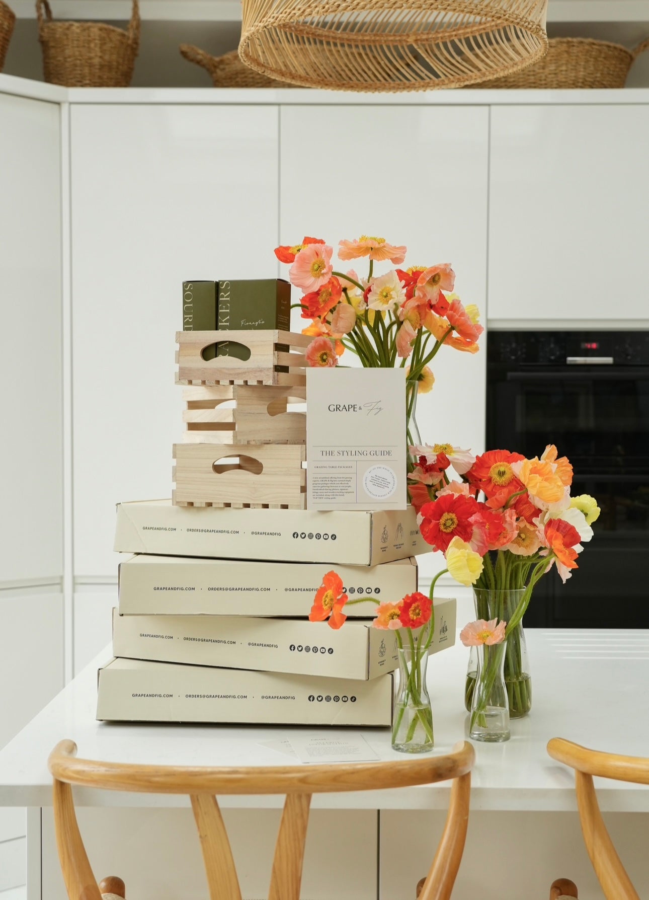 This kit (which you keep!) includes 3 wooden stackers, 4 pre-arranged foliage/floral vases & our styling guide!