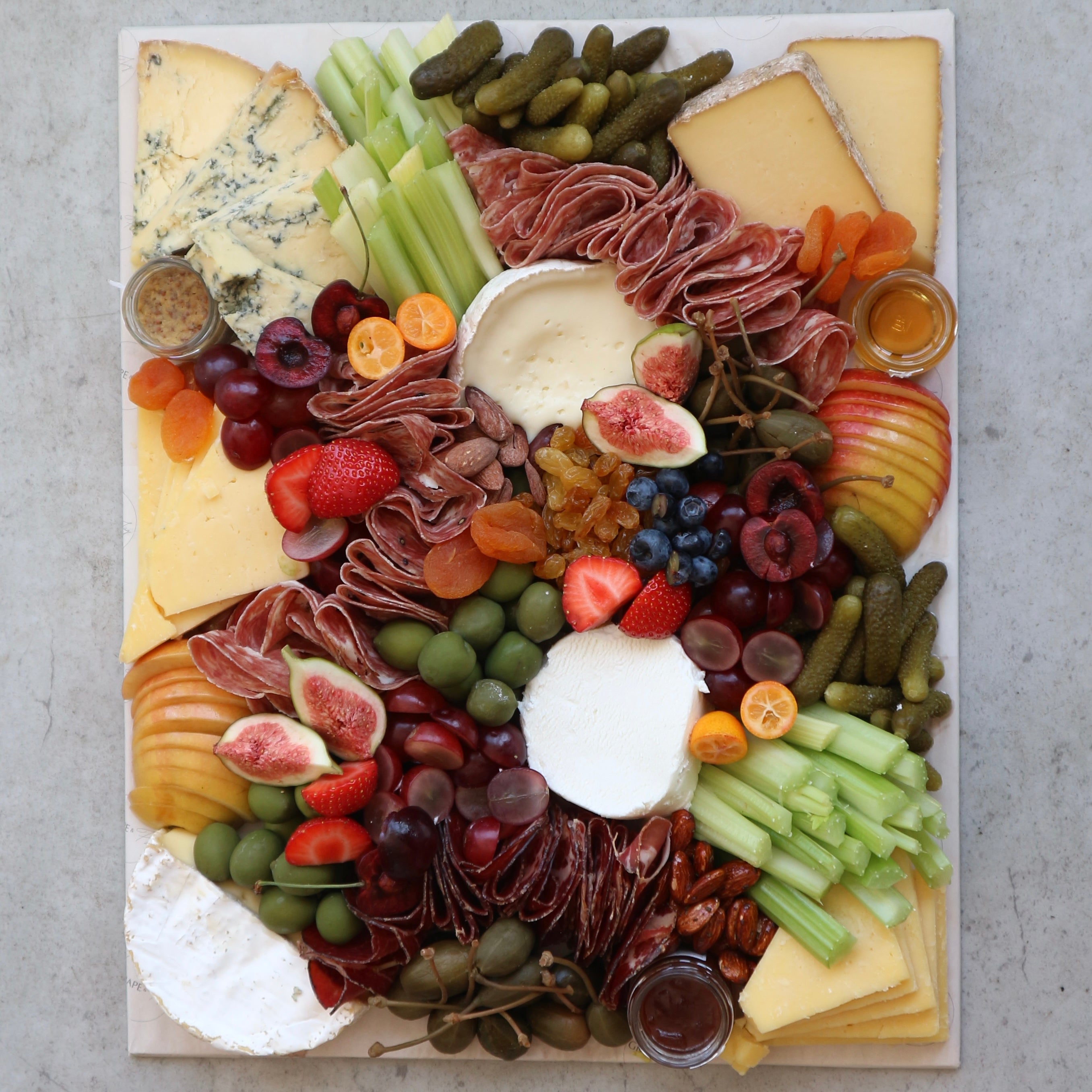 6 British cheeses, 2 British charcuterie, antipasti, nuts, fresh & dried fruits, vegetables, mini wholegrain mustard, honey & chutney pots, topped with seasonal garnishes. This platter contains over 1.1kg of cheese & charcuterie combined.