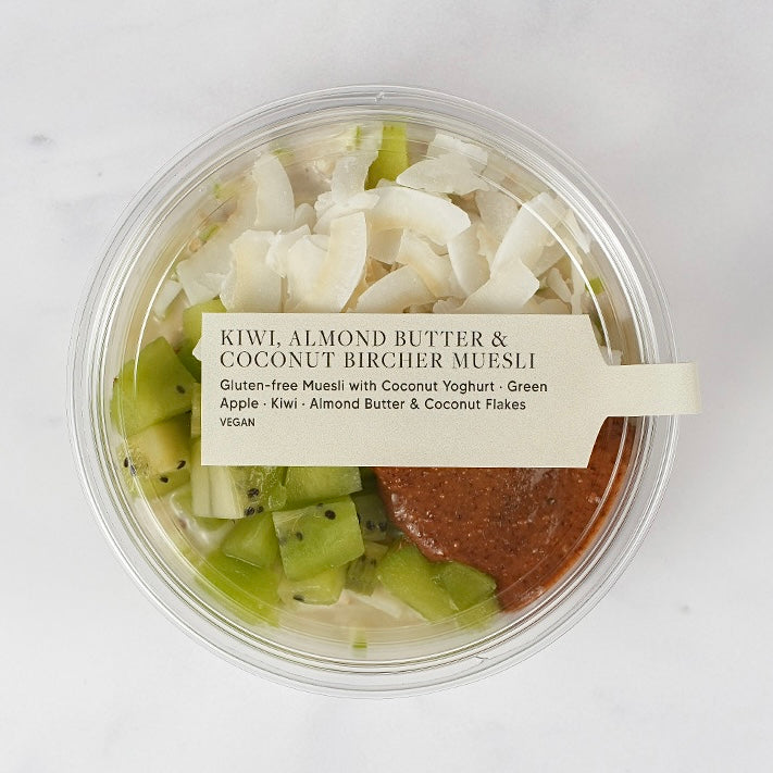 Kiwi, Almond Butter & Coconut Bircher Muesli Pots contains: SULPHUR DIOXIDE & SULPHITES, TREENUTS (V, VG, GF)