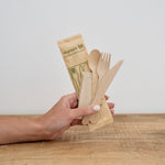 A compostable, individually wrapped knife, fork, spoon & napkin set made from sustainably-sourced birchwood.