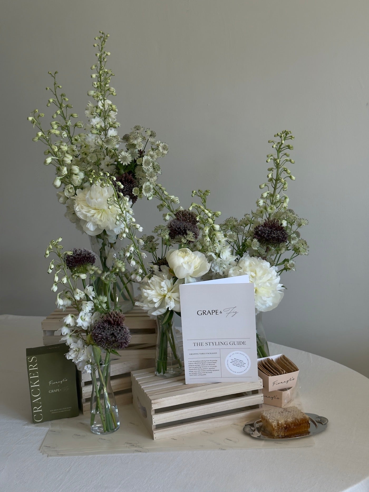 When the elements listed below are hand delivered to you, simply arrange them with the help of our handy styling guide, add your platters & you're all set! Our kits (which you keep!) includes wooden stackers, pre-arranged foliage/floral vases & our styling guide!