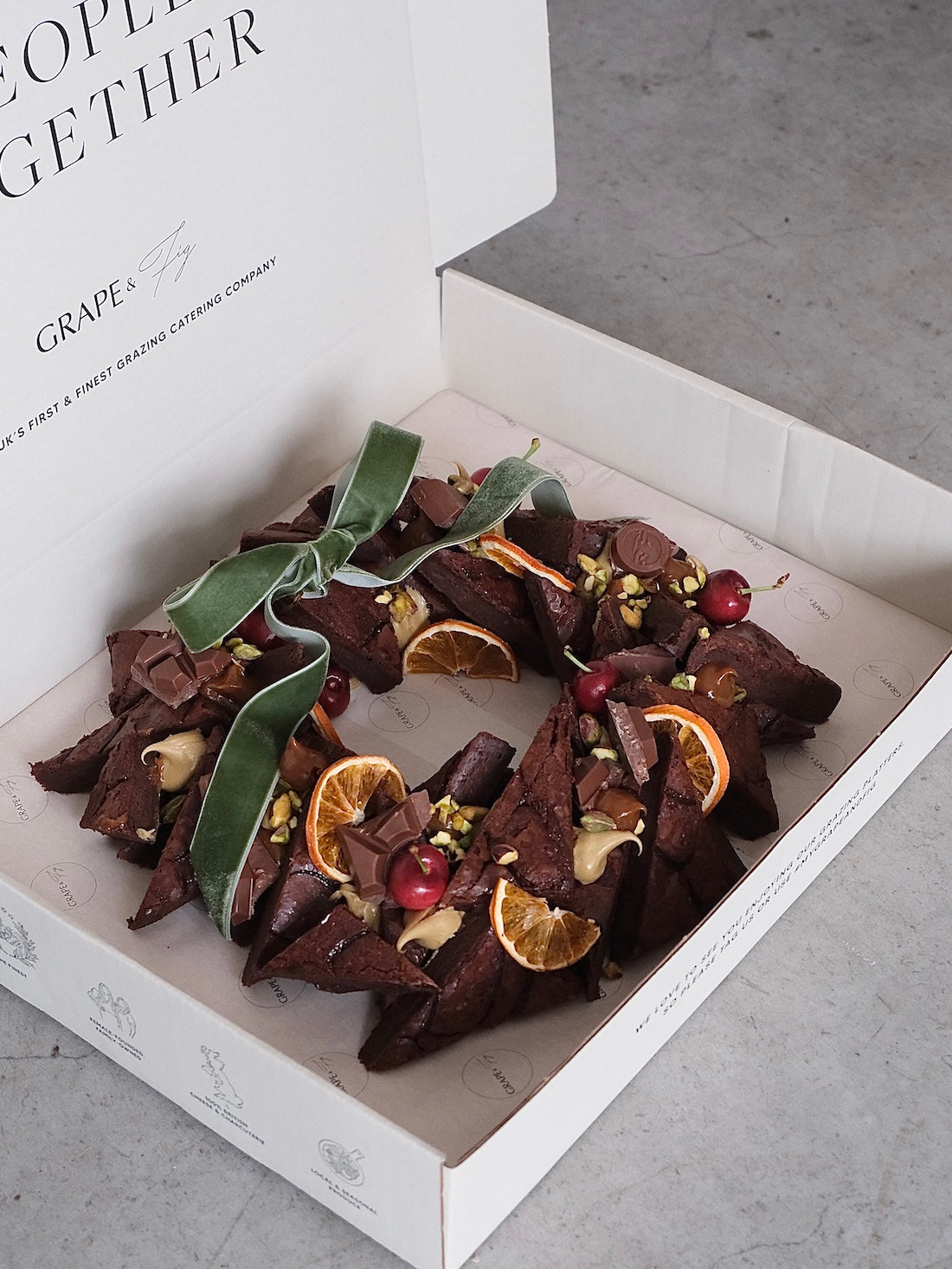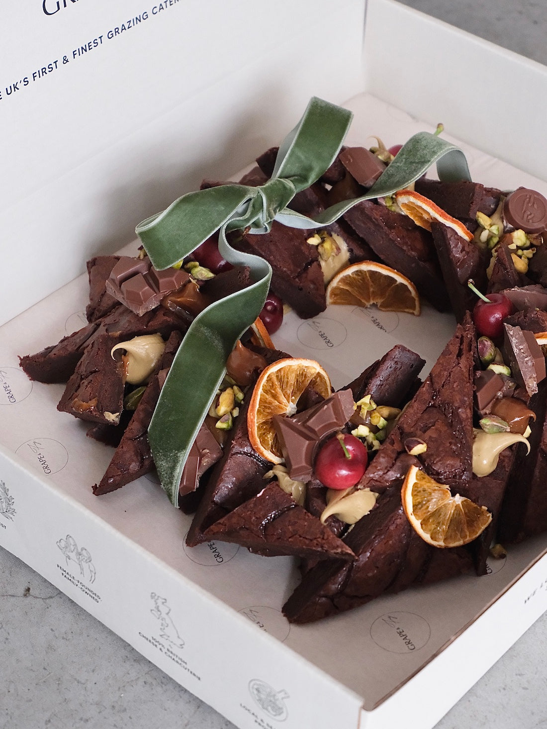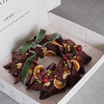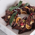 Pure luxurious indulgence in every, single bite. This handcrafted, signature festive wreath is made from a huge slab of rich, fudgy chocolate brownie, enriched with gooey salted caramel for that intense sweet and salty flavour burst. Topped with chocolate ganache, fresh & dried fruit & garnish.