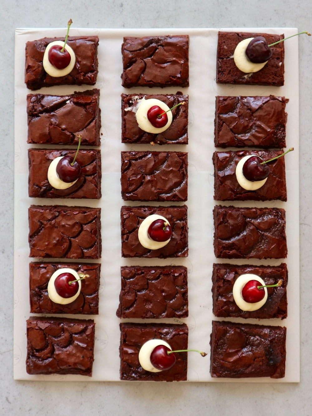 Delicious platter including 18 individual gluten-free salted caramel brownie slices topped with vanilla buttercream & fresh fruit.