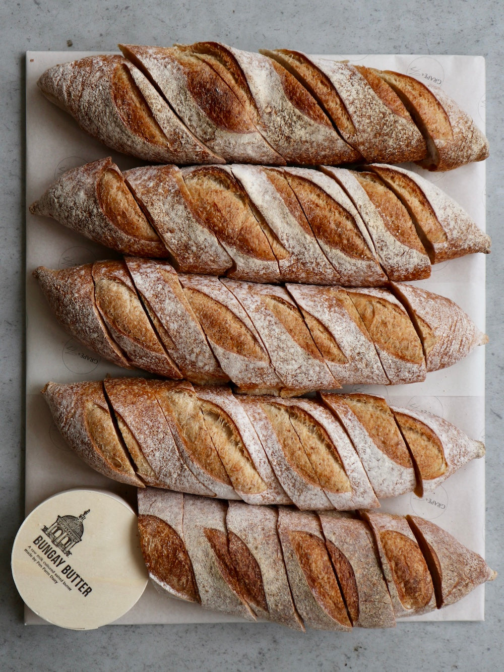 Freshly baked sourdough baguettes, made with a mix of rye, white & wholemeal flour for the ultimate fluffy, yet wholesome salty centre, served with salted English butter.