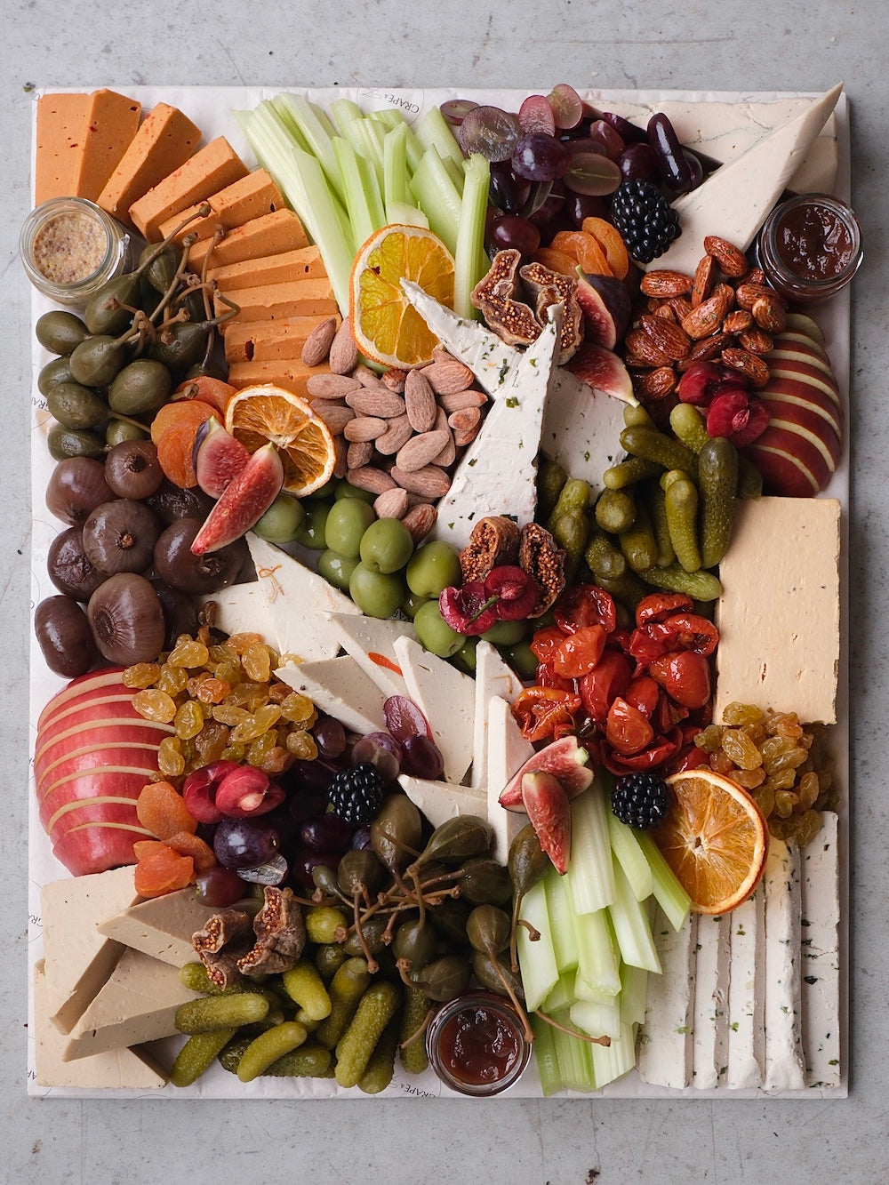 5 British vegan cheeses (made from cashew nuts), antipasti, nuts, fresh & dried fruits, vegetables, mini wholegrain mustard & chutney pots, topped with seasonal garnishes.
