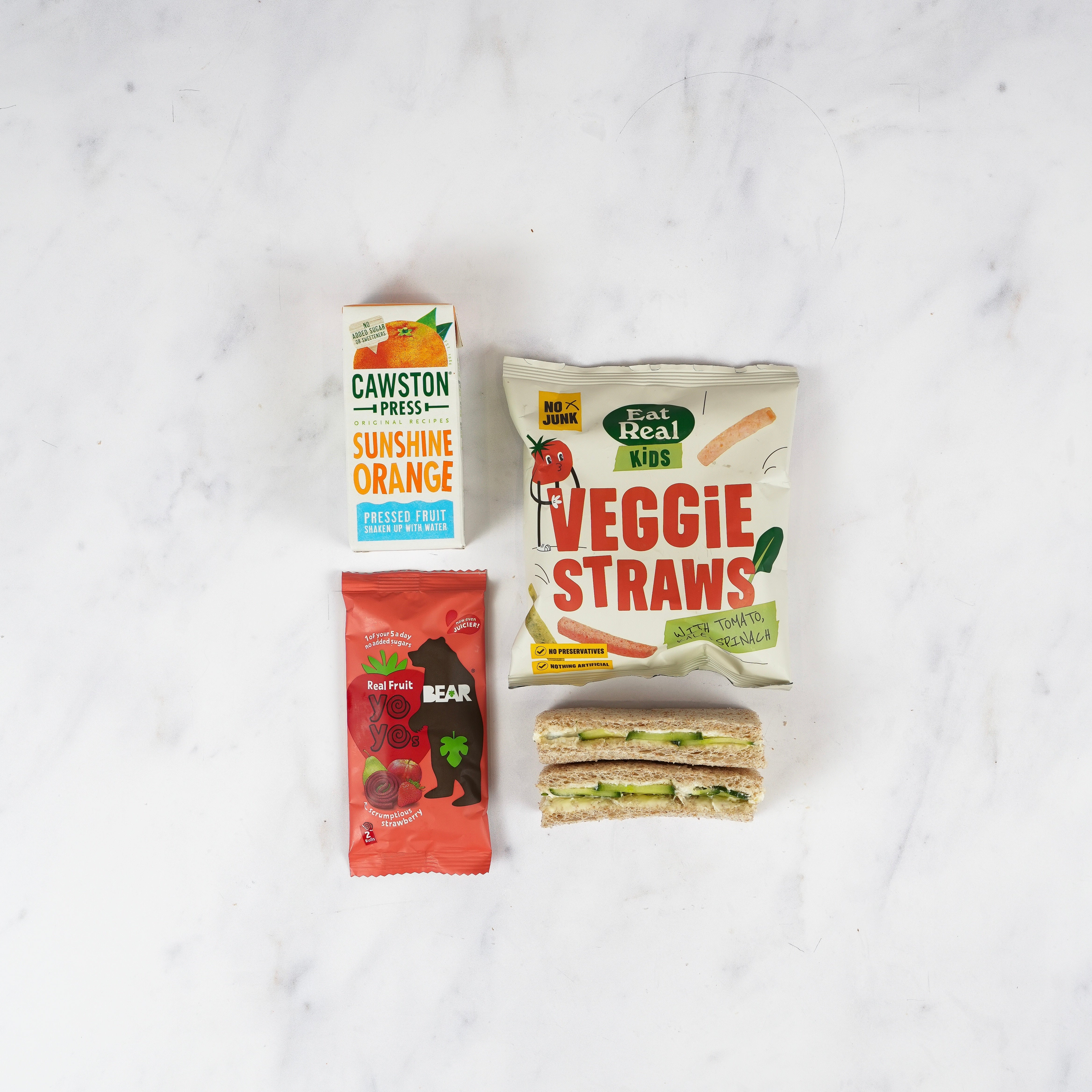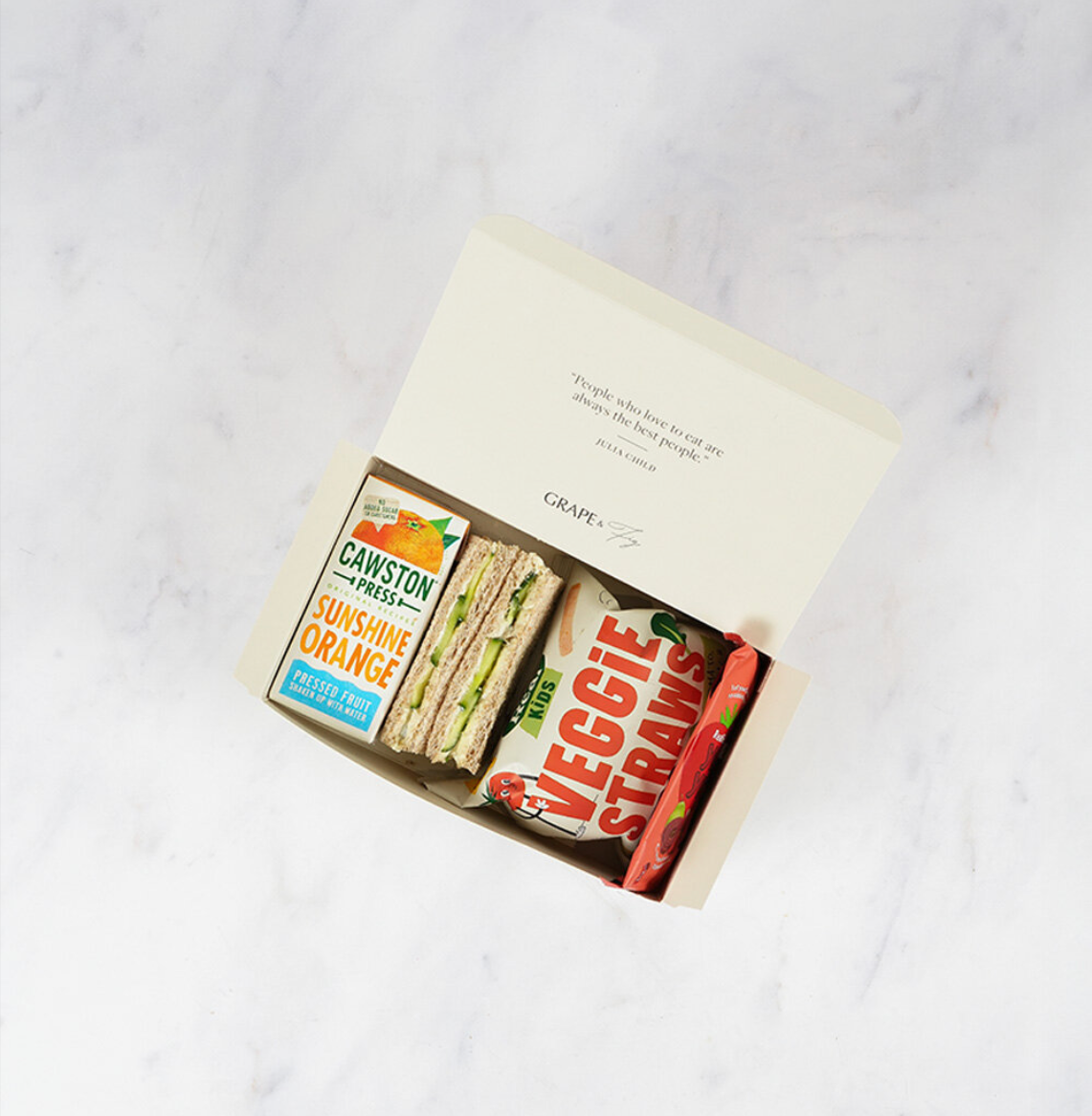 Comes with a Cawston press juice carton, Veggie Straws, Bear fruit yoyo & a choice of a mini ham, cheddar or cream cheese & cucumber sandwich.
