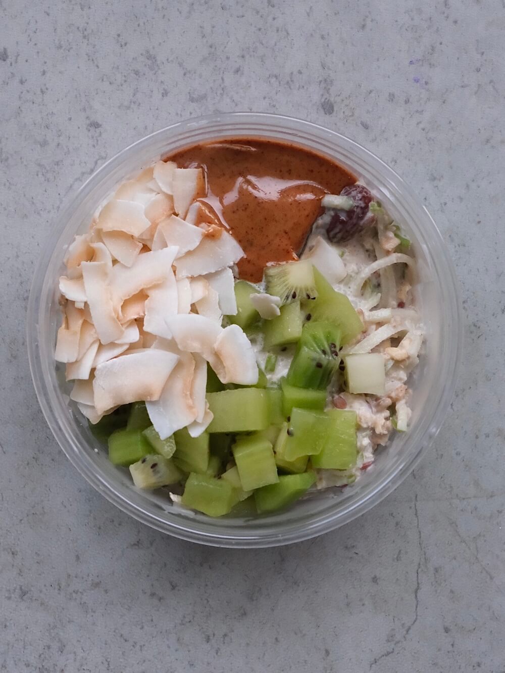 Gluten-free muesli with coconut yoghurt & green apple topped with kiwi, almond butter & coconut flakes.