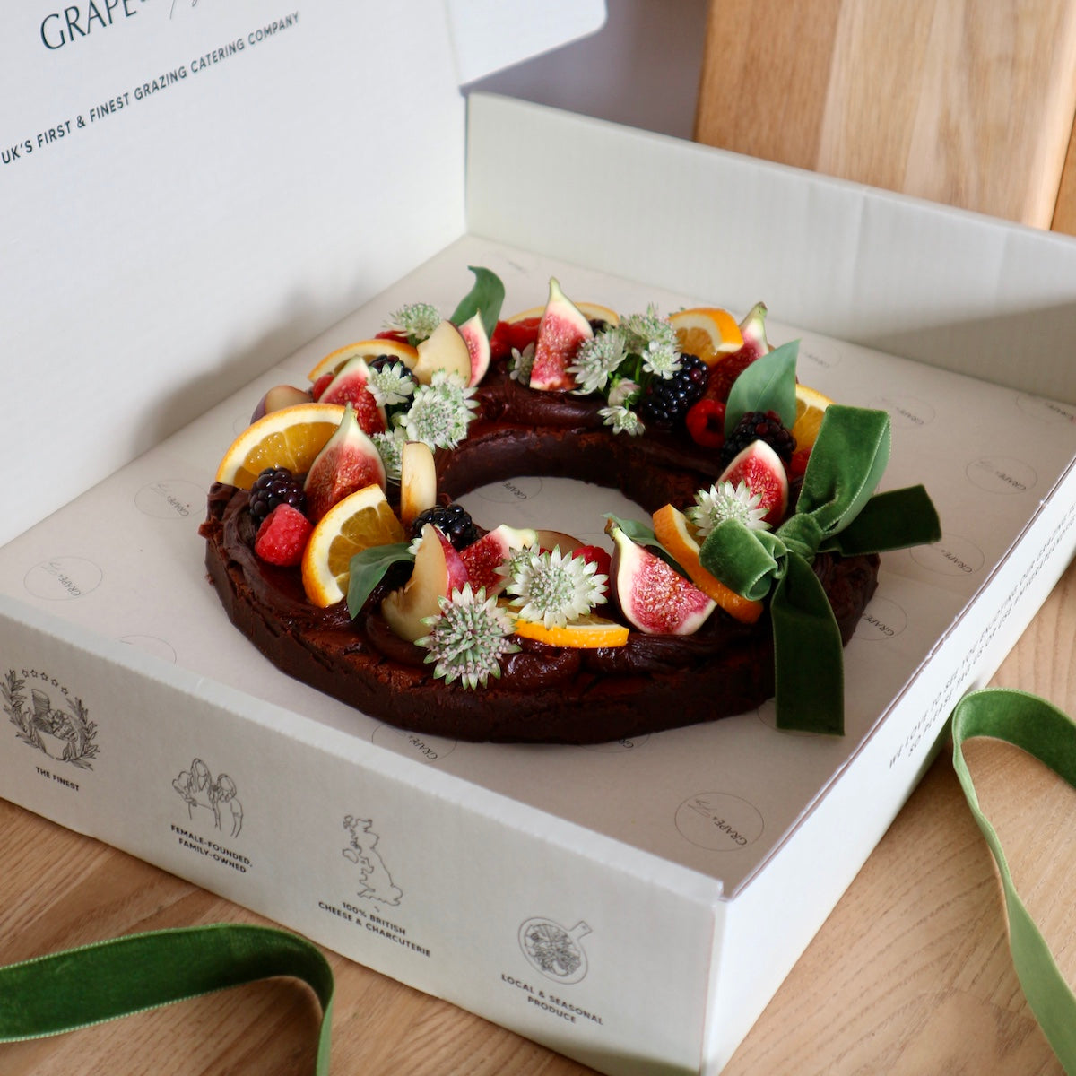 Pure luxurious indulgence in every, single bite. This handcrafted, signature festive wreath is made from a huge slab of rich, fudgy chocolate brownie, enriched with gooey salted caramel for that intense sweet and salty flavour burst. Topped with chocolate ganache, fresh & dried fruit & garnish.
